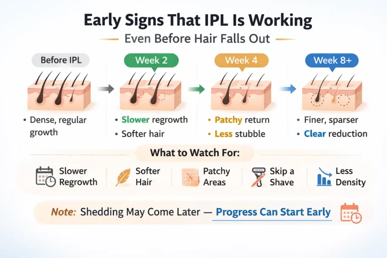 Direct answer: Yes, IPL can be helping even before hair visibly falls out. Early signs often look less dramatic than people expect: slower regrowth, softer or finer-looking hair, slightly patchier return, or the feeling that you need to shave a…
